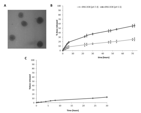 The spherical morphology of BNS-DOX and their nanometric sizes were shown by Transmission electron microscopy (TEM) analysis (Figure 1A).