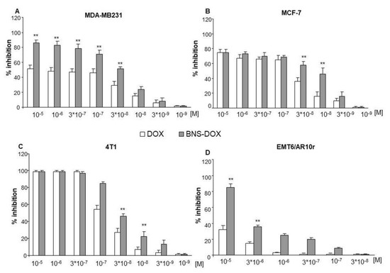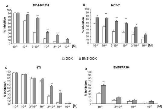 Percentage of cell survival following DOX and BNS-DOX treatment. (A,B) MDA-MB231 and MCF-7 human breast cancer cell lines and (C,D) 4T1 and EMR6/AR10r mouse breast cancer cell lines were treated with increasing concentrations of the drugs for 72 h. Results are expressed as % of viability inhibition of control shown as mean ± SEM (n = 5). Eight replicate wells were used to determine each data point, and five different experiments were performed. * p < 0.05, ** p < 0.01, significantly different from the same concentration of DOX.