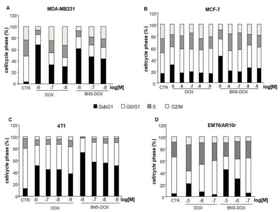 Effects of DOX and BNS-DOX treatment on cell cycle. (A,B) MDA-MB231 and MCF-7 human breast cancer cell lines and (C,D) 4T1 and EMR6/AR10r mouse breast cancer cell lines (1.5 × 105) were treated or not with DOX and BNS-DOX for 72 h and the cell cycle was then assessed by flow cytometry. Graphs represented the % of the quantification of cell cycle phases from three independent experiments.