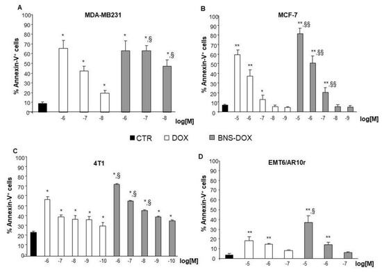Effects of DOX and BNS-DOX treatment on cell death. Annexin-V positive cells were evaluated in (A,B) MDA-MB231 and MCF-7 human breast cancer cell lines and (C,D) 4T1 and EMR6/AR10r mouse breast cancer cell lines cultured for 72 h in the presence or absence of DOX or BNS-DOX. Results are expressed as % of positive cells from five independent experiments (* p < 0.05, ** p < 0.01, versus the control; § p < 0.05, §§ p < 0.01, versus the same concentration).