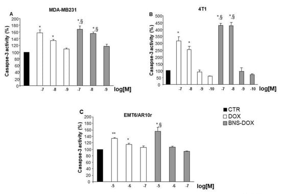 Levels of caspase3 activity after DOX and BNS-DOX treatment. Caspase-3 activity was evaluated in (A) MDA-MB231 human breast cancer cell lines and (B,C) 4T1 and EMR6/AR10r mouse breast cancer cell lines cultured for 72 h in the presence or absence of DOX or BNS-DOX. Results are expressed as % calculated as follows: (result displayed by each treatment/the results displayed by untreated cells) from five independent experiments (* p < 0.05, ** p < 0.01, versus the control; § p < 0.05 versus the same concentration).