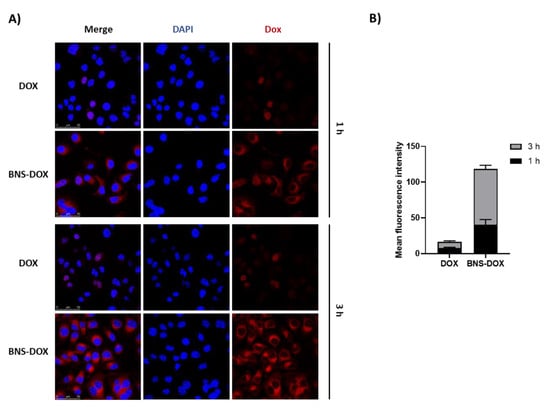 To evaluate the cellular uptake of BNS-DOX in EMT6 cells confocal microscopy studies were carried out, exploiting the intrinsic red fluorescence of doxorubicin. BNS-DOX were easily internalized in cells, in agreement with our previous studies. Figure 7A reports the confocal microscopy images after 1 h and 3 h of incubation, showing the localization of BNS-DOX in cell cytoplasm around the nucleus. In contrast, a lower mean fluorescence intensity was observed for the cells treated with free DOX (Figure 7B).