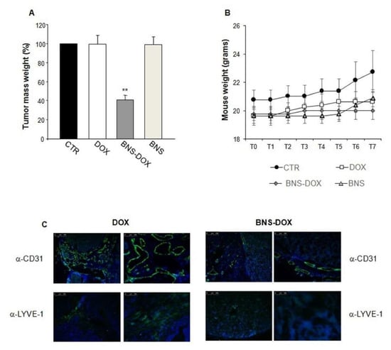 Effect of DOX and BNS-DOX on tumor growth in vivo. Thirteen-week-old female wt or BALB-neuT mice were treated with i.v. injection of 2 mg/kg DOX, or BNS-DOX, or BNS or the same volume of PBS as a control for six weeks (once every week). Mice were sacrificed at the seventh week after the first injection. (A) The graph shows an average of the tumor mass weight, expressed as % compared to the control group. (B) Weight of the animals was evaluated every week from the day of the first injection, performed at T0 (when the tumor was palpable); each treatment involved 8 mice. (C) Immunofluorescence staining of cluster of differentiation 31 (CD31) and lymphatic vessel endothelial hyaluronan receptor 1 (LYVE-1) of tumour tissue sections from of Neu-T mice treated with DOX or BNS-DOX. The slides were stained with either pAb rabbit α-mouse CD31 or pAb rabbit α-mouse LYVE-1 plus a secondary antibody α-rabbit conjugated with Alexa Fluor® 488. Representative images of three independent experiments are shown (scale bar 100 µm). ** p < 0.01.