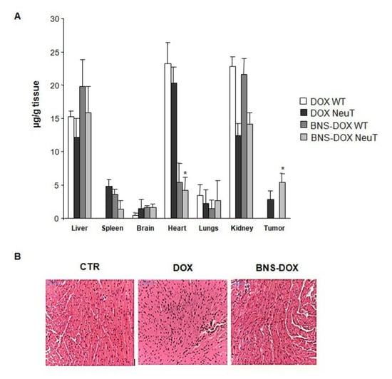 (A) Tissue biodistribution of DOX (expressed as µg/g tissue) after i.v. administration to BALB-neuT and BALB mice of 2 mg/kg of DOX or BNS-DOX. (B) Histopathologic analysis of the heart. Hematoxylin and eosin (H&E) stained were observed with 20× magnification (scale bar 100 µm). Representative image of heart tissue from Neu-T mice treated with phosphate buffered saline (PBS), DOX, or BNS-DOX. * p < 0.05.