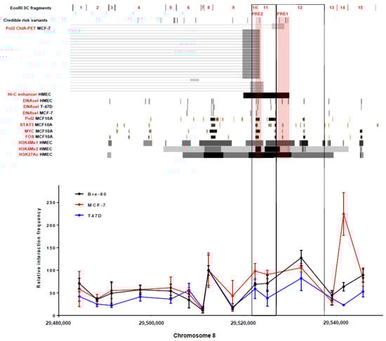 To map chromatin interactions between specific regions of the 8p12 risk locus (defined by EcoRI restriction fragments; Figure 1) and the DUSP4 promoter in breast cells, chromatin conformation capture (3C) analyses were conducted in breast cancer (MCF-7 and T-47D) and normal mammary epithelial (Bre-80) cell lines. Some level of interaction with the DUSP4 promoter was observed in all three cell lines across the 3C restriction fragments at the risk locus (Figure 1). Notably, this broad level of activity is not often observed in 3C analyses. For example, the 2q35 and 5q11.2 breast cancer risk loci are considerably closer (≤100 kb) to corresponding promoter targets than 8p12 CCVs are to the DUSP4 promoter region, yet many restriction fragments at these loci have no observable promoter interaction [10,11]. At the 8p12 locus, three 3C restriction fragments (#10, #11 and #12) with Hi-C and/or ChIA-PET evidence of chromatin looping to the DUSP4 promoter demonstrated peaks of interaction in the breast cell lines (Figure 1), highlighting two fragments (#11 and #12) which contain CCVs (two and three, respectively) for further analysis.