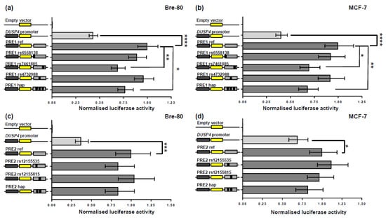 Bre-80, MCF-7, and T-47D cells were transfected with equimolar amounts of luciferase reporter constructs and 50 ng of the Renilla luciferase pRL-SV40 construct with Lipofectamine 2000. The total amount of transfected DNA was kept constant at 600 ng for each construct by adding pUC19 as a carrier plasmid. Luciferase activity was measured 24 h post-transfection by the Dual-Glo Luciferase Assay System. To correct for variation in transfection efficiency or cell lysate preparation, Firefly luciferase activity was normalised to that of the Renilla luciferase. All DUSP4 promoter constructs had great activity compared with the negative control (empty pGL3-Basic construct). Data were log-transformed and statistical significance was assessed by two-way ANOVA, followed by Dunnett’s multiple comparisons test in GraphPad Prism (version 7.02, GraphPad Software, San Diego, CA, USA).