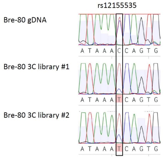 DNA was amplified by PCR of two independent Bre-80 3C libraries using the DUSP4 promoter bait primer and a reverse primer specific to the PRE2 fragment containing rs12155535 (Supplementary Table S2). The region containing rs12155535 was also amplified from Bre-80 genomic DNA as a control. Sanger sequencing (QIMR Berghofer sequencing facility) was performed to determine the alleles present in the interacting PRE2 fragment.