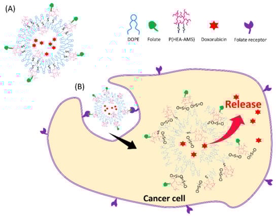 In this study, oxidation-sensitive and cancer cell-targetable liposomes were prepared by stabilizing DOPE liposomes with folate-conjugated poly(hydroxyl ethyl acrylate-co-allyl methyl sulfide) (F-P(HEA-AMS)). Since HEA is hydrophilic and AMS is lipophilic, P(HEA-AMS) is a kind of amphiphilic polymer. AMS can act as a hydrophobic anchor and be hydrophobically intercalated into the bilayers with HEA segments orienting toward aqueous bulk phase. Thus, the copolymer would be able to stabilize DOPE liposomes (Figure 1A). Owing to folate conjugated to the copolymer, the liposomes can target cancer cells that mostly are known to overexpress folate receptors and they would be readily internalized into the cells via receptor mediated endocytosis. Doxorubicin (DOX) was loaded in the liposomes as an anti-cancer drug. DOX is known to kill cancer cells by being inserted between DNA double strands and suppressing the biosynthesis of proteins. It is also known that oxygen free radicals are formed by DOX within cancer cells and they peroxidize the cellular membrane lipids and exterminate the cancer cells []. In addition to inherent intracellular ROS, DOX-induced oxygen free radicals would also cause the methyl sulfide of AMS of the copolymer to be oxidized. Once oxidized within cells, AMS would hardly act as a hydrophobic anchor. As a result, the polymeric stabilizer would be desorbed from the liposomal membrane and it would cause the disintegration of liposomes and trigger the release of DOX from the liposomes (Figure 1B).