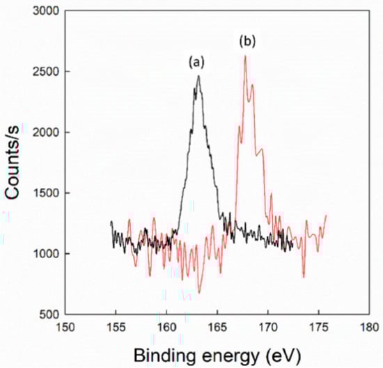 Figure 3 shows the XPS spectrum of P(HEA-AMS) and H2O2-P(HEA-AMS). A strong peak around 163.5 eV was found in the spectrum of P(HEA-AMS) and it could be ascribed to the sulfur signal of the sulfide moiety (i.e., the AMS unit). H2O2-P(HEA-AMS) showed a relatively broad peak centered at 168 eV with a shoulder at 166 eV. Those signals could be assigned to the sulfur electron of the sulfone moiety and that of the sulfoxide one, respectively. Thus, it could be said that the AMS unit was readily oxidized by H2O2 under our experimental condition.