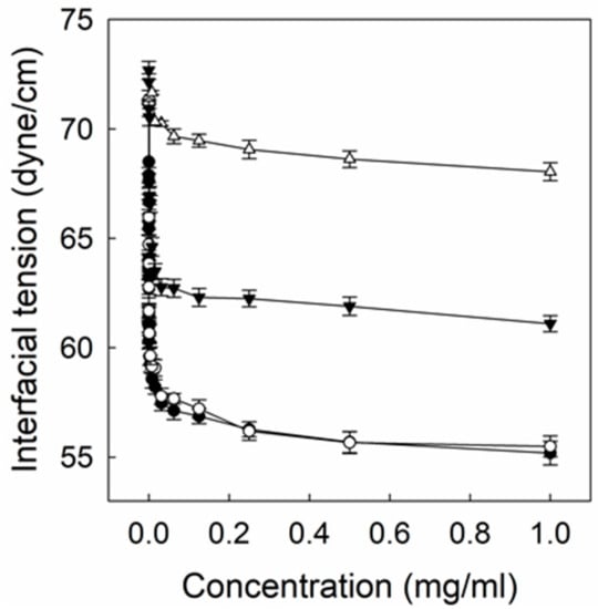 - Bąk, A.; Podgórska, W. Interfacial and surface tensions of toluene/water and air/water systems with nonionic surfactants Tween 20 and Tween 80. Colloids Surf. A Physicochem. Eng. Asp. 2016, 504, 414–425. [Google Scholar] [CrossRef]