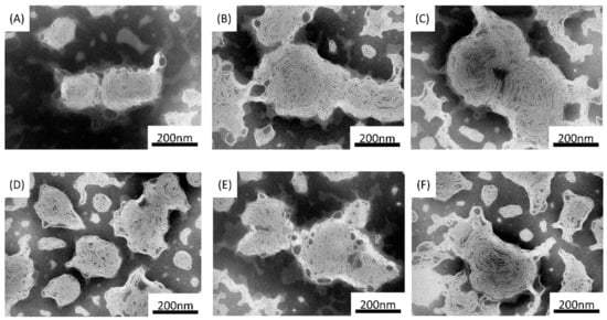 The structure of DOPE liposomes stabilized with copolymers was investigated by transmission electron microscopy. In order to visualize the bilayer and the lamellar structure, the liposomes were negatively stained [,,]. 100 μL of the liposome suspension was mixed with the same amount of phosphotungstic acid solution (2% (w/v)) and the mixture was stood at room temperature for 3 h for the staining of the liposomes. An aliquot amount of the stained liposome suspension was put on a formvar/copper-coated grid and it was dried overnight at room temperature. The replica was subjected to microscopy using a transmission electron microscope (TEM; LEO-912AB OMEGA, LEO, Germany; located in the Korea Basic Science Institute (KBSI), Kangwon, Chuncheon, Korea).