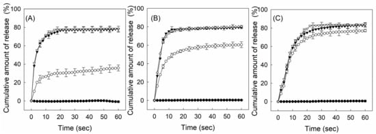 H2O2 (30%, v/v) was mixed with PB (10 mM, pH 7.4) so that the concentration was 0% (v/v), 0.5% (v/v), 1.0% (v/v), and 2.0% (v/v). 0.1 mL of liposome suspension was injected to 1.9 mL of H2O2 solution contained in a glass cuvette placed in the cuvette hold of a fluorescence spectrophotometer (Hitachi F2500, Hitachi, Japan). The fluorescence intensity was measured with time for 60 s. The excitation wavelength and emission one were 495 nm and 514 nm, respectively. The release % was calculated using the following Equation (2) [,]: