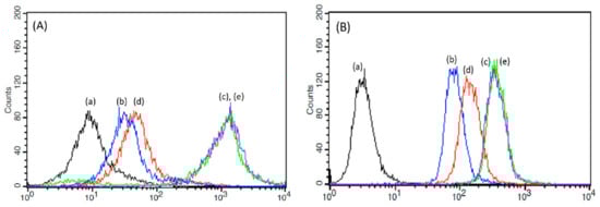 Figure 7 shows the fluorescence intensity distribution obtained using flow cytometry (FACS) of KB cells (a human cancer cell type originating from the cervix) (A) and LN229 cells (human glioma cell line) (B) treated with free DOX, liposome/P(HEA-BMA)(100/1)/DOX, liposome/F-P(HEA-BMA)(100/1)/DOX, liposome/P(HEA-AMS)(100/1)/DOX, and liposome/F-P(HEA-AMS)(100/1)/DOX. When the cells were treated with free DOX, the fluorescence intensity at the maximum cell count was about 10 and it was the lowest among the test samples tested. When the cells were treated with liposome/P(HEA-BMA)(100/1)/DOX, the fluorescence intensity at the maximum cell count was about 9000 and it was higher than that obtained with the cells treated with free DOX. This suggested that the liposomal DOX was internalized into the cells more efficiently than free DOX. It was reported that particulate matters including liposomes were translocated into the cells via particulate endocytosis and small solutes including DOX were taken up by the cells via pinocytosis [,]. Small solutes would also be able to be internalized into the cells via simple diffusion. Since DOX was loaded and localized in the liposomes (specific loading %: 1.82–2.39), the cellular uptake of liposomes seemed to transport DOX to the cells more effectively than the molecular level transport phenomena (i.e., pinocytosis). The cellular uptake would be a reason why the fluorescence intensity of the cells treated with liposome/P(HEA-BMA)(100/1)/DOX was stronger than that of the cells treated with free DOX. When the cells were treated with liposome/F-P(HEA-BMA)(100/1)/DOX, the fluorescence intensity at the maximum cell count was about 1.5 × 103 and it was much stronger than that obtained with the cells treated with liposome/P(HEA-BMA)(100/1)/DOX. Folate-receptor was reported to be overexpressed on the surface of KB cells and LN229 cells [,,,]. Thus, the folate-conjugated liposome would readily be able to bind to the cancer cells and tumor cells through receptor-ligand interaction then the liposome would be likely to be internalized into the cells via receptor-mediated endocytosis. The strong fluorescence intensity of the cancer cells and tumor cells treated with the folate-conjugated liposomes could be ascribed to the receptor-mediated uptake. The cancer cells and the tumor cell treated with liposome/P(HEA-AMS)(100/1)/DOX and liposome/F-P(HEA-AMS)(100/1)/DOX showed similar fluorescence intensity distributions to the cancer cells and tumor cells treated with liposome/P(HEA-BMA)(100/1)/DOX and liposome/F-P(HEA-BMA)(100/1)/DOX, respectively. This indicates that the former liposomes were as potent as the latter ones in terms of their translocation into the cancer cells and tumor cells.
