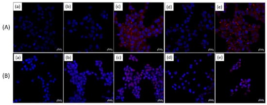 CLSM micrograph of KB cells (A) and LN229 cells (B) treated with free DOX (a), liposome/P(HEA-BMA)(100/1)/DOX (b), liposome/F-P(HEA-BMA)(100/1)/DOX (c), liposome/P(HEA-AMS)(100/1)/DOX (d), and liposome/F-P(HEA-AMS)(100/1)/DOX (e). In all cases, cells were also treated with DAPI to dye the nuclei.
