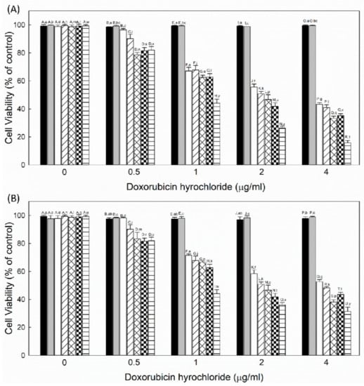 The DOX concentration of liposome suspensions was adjusted to 5, 10, 20, and 40 μg/mL by diluting the suspensions with PBS (10 mM, pH 7.4). DOX-free liposomes suspensions (i.e., liposome/F-P(HEA-BMA)(100/1) and liposome/F-P(HEA-AMS)(100/1)) were used as positive controls. The liposome content of the control suspensions was made to be the same as that of the DOX-loaded liposome suspensions. DOX solution (in PBS (10 mM. pH 7.4)) was used as an additional positive control and PBS (10 mM, pH 7.4) as a negative control. Each well of a 96-well plate was seeded with 200 μL of cell (1 × 104 cells/mL) and cultured at 37 °C for 24 h in a CO2 incubator. After the culture medium was taken off, RPMI free of FBS (180 μL) and each test sample (20 μL, DOX-loaded liposome suspensions, empty liposome suspensions, DOX solution, and blank PBS (10 mM, pH 7.4)) were put to each well, and incubated for 24 h in a CO2 incubator thermostated at 37 °C. The culture medium was taken off, the residual was washed off from the cell by rinsing them with PBS (10 mM, pH 7.4)), MTT reagent (20 μL, 5 mg/mL) was put to each well, and stored at the incubator for 4 h to induce the production of formazan. The supernatant was decanted off and formazan was dissolved out by adding DMSO (200 μL) to each well. The optical density of formazan solution was measured at 540 nm on a microplate reader (N10588, Thermo Fisher Scientific, Waltham, MA, USA). The percent of the optical density of formazan obtained from cells treated with a test sample or a control with respect to the optical density of formazan obtained from cells treated with the empty buffer solution was represented as cell viability.
