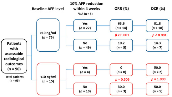 As 10% AFP reduction might not be meaningful for HCCs with baseline level less than 10 ng/mL, the AFP response was further categorized by baseline AFP level. For patients with baseline AFP ≥10 ng/mL, significantly higher ORR (63.6% vs. 10.2%, p < 0.001) and DCR (81.8% vs. 14.3%, p < 0.001) were observed in those with early AFP reduction than those without. However, such association was not observed in patients with baseline AFP level <10 ng/mL (Figure 1).