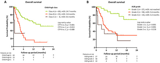 OS of HCC patients stratified by (A) Child–Pugh classification, and (B) Albumin-bilirubin (ALBI) grade.
