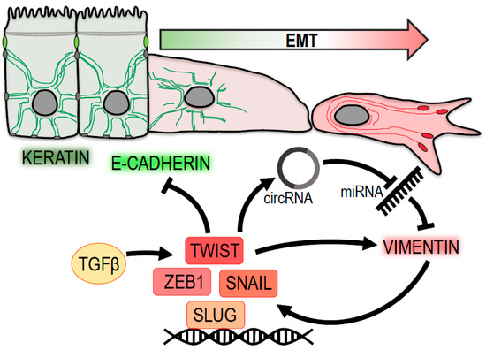 Recent data suggest that Twist, one of the main EMT drivers, promotes EMT not only by E-cadherin suppression but also by negative regulation of vimentin miRs. It has been reported that Twist1 activates the expression of Cullin2 circular RNA (circ-10720), which absorbs miRNA targeting vimentin, leading to increased vimentin mRNA levels [29].