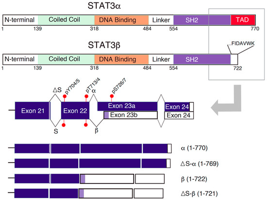 Signal transducer and activator of transcription 3 (STAT3) functional domains and alternative splicing isoforms. Shown are six STAT3 domains: the N-terminus, the coiled-coil domain, the DNA-binding domain, the linker domain, the Src homology 2 (SH2) domain, and the C-terminal transactivation (TAD) domain in STAT3α or unique seven residues in STAT3β. Two splice sites near the 3′ end of the STAT3 gene produce four STAT3 isoforms: α (the longest isoform with the TAD domain at the C-terminus), β (a shorter isoform with distinct seven residues at the C-terminus), Ser-701-deleted α (ΔS-α), and Ser-701-deleted β (ΔS-β). White boxes indicate the noncoding 3′ UTR, and light blue boxes depict coding sequences due to alternative splicing [20] (see details in the text).