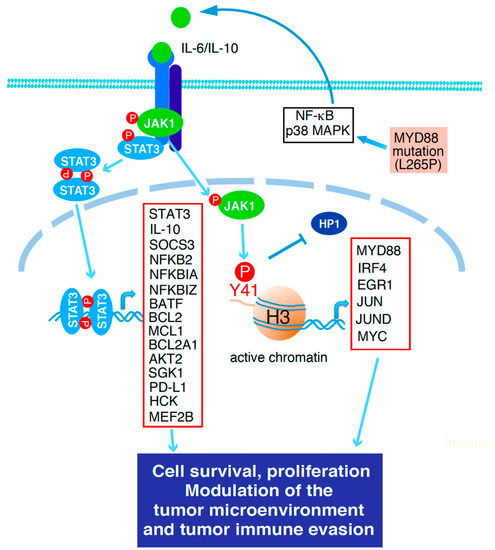 DLBCL is a type of aggressive non-Hodgkin lymphoma, accounting for 30–40% of newly diagnosed cases [62]. Gene expression profiling has identified two main molecular subtypes termed activated B-cell-like (ABC) and germinal center B-cell-like (GCB) DLBCL cells [63,64,65]. ABC DLBCL cells bear genetic alterations in the Toll-like receptor (TLR) and B-cell receptor (BCR) signaling pathways [66,67,68]. These two hallmark oncogenic pathways lead to high NF-κB activity [69] that induces production of IL-6 and IL-10 in ABC DLBCL cells (Figure 2) [68]. Autocrine action of IL-6 and IL-10 results in constitutive activation of JAK1 [70] and STAT3 [34,36,71,72], which promotes the survival and proliferation of ABC DLBCL cells. In addition to a canonical pathway, we characterized an epigenetic mechanism of JAK1 in gene regulation [70,73,74]. JAK1 is transferred into the nucleus, where the kinase directly phosphorylates histone H3 to activate gene expression [70]. We identified ~3000 target genes by JAK1 through this mechanism, including NF-κB pathway genes [70]. These findings demonstrate a feed-forward regulatory mechanism between the JAK1 and NF-κB signaling pathways in gene expression, which may play an important role in the pathogenesis of ABC DLBCL.