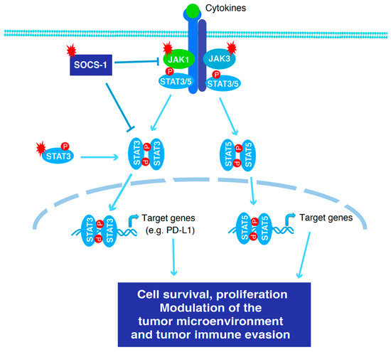 The JAK/STAT signaling pathway mediated by the common γc receptor-dependent cytokines IL-2, -4, -7, -9, -15, and -21 plays critical roles in T-cell immune responses [120]. Abnormal activation of the JAK/STAT pathway, which can be assessed by STAT3 and STAT5 phosphorylation, is pervasive in diverse T-cell malignancies [121]. In peripheral T-cell lymphoma (PTCL) and extranodal NKTCL, recurrent mutations in STAT3 are most frequent, followed by JAK1, JAK3, and SOCS1 (Table 1) [44]. STAT3 mutations are activated and lead to increased phosphorylation and transcriptional activity of STAT3 [25]. In addition to promoting cell survival and proliferation, constitutive activation of STAT3 in cancer cells causes high levels of PD-L1 expression, which may facilitate tumor immune evasion (Figure 3) [44]. Activating STAT3 mutations are present in 50% of NK cell lines and 67% of γδ-T-cell lines (67%) but only in 5.9% of NKTCL and 8.3% of γδ-PTCL patient samples [43]. This suggests that these mutations are critical in cell survival independent of stromal components and therefore selectively enriched in cell lines. In anaplastic large cell lymphoma (ALCL), JAK1 and STAT3 are activated by high levels of cytokines, including IL-6 [122]. The treatment with the JAK1/2 inhibitor Ruxolitinib reduces xenografted ALCL tumor growth [122].