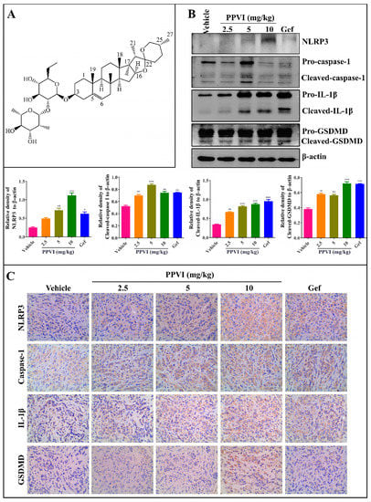Figure 1. Polyphyllin VI (PPVI) activates the NLRP3 inflammasome in A549 bearing athymic nude mice. (A) Chemical structure of PPVI. (B) Tumor tissue lysates were analyzed by Western blot for NLRP3, caspase-1, IL-1β, GSDMD and β-actin. Bar chart indicates the relative density of the protein to β-actin; bars, S.D. ** p ≤ 0.01; *** p ≤ 0.001. The full-length Western blotting images are shown in Figure S4. (C) The expression of NLRP3, caspase-1, IL-1β and GSDMD in the tumor tissue of A549-bearing athymic nude mice were analyzed by the immunohistochemistry method. Magnification: 40×, Scale bar: 40 µm.