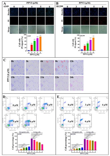 Figure 2. PPVI induces lytic cell death in A549 and H1299 cells. A549 cells (A) and H1299 cells (B) were treated with PPVI for 24 h. The cells were then stained with 2 μg/mL PI (red, staining dying cells) plus 2 μg/mL Hoechst 33342 (blue, staining all cells) for 10 min, and observed by fluorescent microscopy. Bar chart indicates the percentage of cells with PI signal to blue signal; bars, S.D. *** p ≤ 0.001. Magnification: 10×, Scale bar: 25 µm. (C) The time-lapse phase-contrast and fluorescent images of A549 cells stained with PI and Hoechst 33342 solution were taken at the indicated timepoints after the stimulation of 6 μM PPVI. The images in the red, blue and white channels were merged at the same field. Red arrow indicated the cells at 6–9 h, beginning with membrane blebbing and producing apoptotic body-like cell protrusions (termed pyroptotic bodies) prior to plasma membrane rupture. The real-time video was included in Video S1. Data shown are representative of at least three independent experiments. Magnification: 10×, Scale bar: 100 µm. Pyroptotic cells or living cells of A549 cells (D) and H1299 cells (E) treated as indicated graded concentrations were measured by flow cytometry using an annexin V-FITC/PI apoptotic detecting kit. Annexin V+/PI+ indicated the pyroptotic cells and annexin-V/PI represented living cells. Bar chart indicates the percentage of pyroptotic cells and living cells; bars, S.D. ** p ≤ 0.01, *** p ≤ 0.001.
