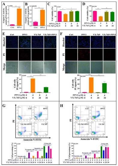Figure 3. PPVI induces cell death via the activation of caspase-1 in A549 and H1299 cells. A549 cells (A) and H1299 cells (B) were treated with 4 μM PPVI for 24 h; the activated caspase-1 were then measured by using a Caspase-1 Activity Assay Kit (Colorimetric) according to the manufacturer’s instructions. Bar chart indicated the amount of pNA in A549 and H1299 cells. A549 cells (C) and H1299 cells (D) were treated with PPVI or co-treated with PPVI and VX-765 at the indicated concentration for 24 h. After treatment, the cytotoxicity was measured by using MTT assay. Bar chart indicates the cell viability of A549 and H1299 cells; bars, S.D. * p ≤ 0.05; ** p ≤ 0.01. A549 cells (E) and H1299 cells (F) were treated with PPVI or co-treated with PPVI and VX-765 at the indicated concentration for 24 h. The cells were then stained with 2 μg/mL PI (red, staining dying cells) plus 2 μg/mL Hoechst 33342 (blue, staining all cells) for 10 min, and observed by fluorescent microscopy. Bar chart indicates the percentage of cells with PI signal compared to blue signal. Magnification: 10×, Scale bar: 100 µm. Necrotic cells, pyroptotic cells, apoptotic cells or living cells of A549 cells (G) and H1299 cells (H), treated as indicated graded concentrations, were measured by flow cytometry using an annexin V-FITC/PI apoptotic detecting kit. Annexin V-/PI+ indicated the necrotic cells, annexin V+/PI+ indicated the pyroptotic cells, annexin V+/PI represented apoptotic cells and annexin-V/PI represented living cells. Bar chart indicates the percentage of necrotic cells, pyroptotic cells, apoptotic cells and living cells; bars, S.D. ** p ≤ 0.01, *** p ≤ 0.001.