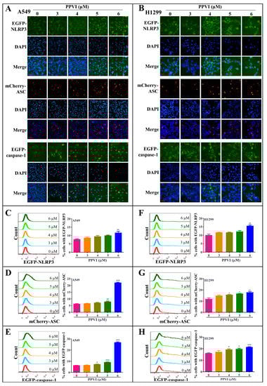 Figure 4. PPVI increased the expression of NLRP3, ASC and caspase-1 in A549 and H1299 cells. A549 cells (A) and H1299 cells (B) transiently transfected with EGFP-N1-NLRP3, mCherry-C1-ASC and EGFP-N1-caspase-1 plasmids for 24 h were treated with PPVI as indicated by the graded concentrations for another 24 h. After treatment, the cells were fixed with 4% PFA, and the representative images were captured using the fluorescence microscope. Magnification: 40×. Scale bar: 25 μm. A549 cells (CE) and H1299 cells (FH) transiently transfected with EGFP-N1-NLRP3, mCherry-C1-ASC and EGFP-N1-caspase-1 plasmids for 24 h were then treated with PPVI as indicated by the graded concentrations for another 24 h. After treatment, the cells were trypsinzed and collected for the analysis of fluorescence intensity by flow cytometry. Bar chart indicates the percentage of cells with GFP or mCherry signal in A549 and H1299 cells; bars, S.D. * p ≤ 0.05; ** p ≤ 0.01; *** p ≤ 0.001.