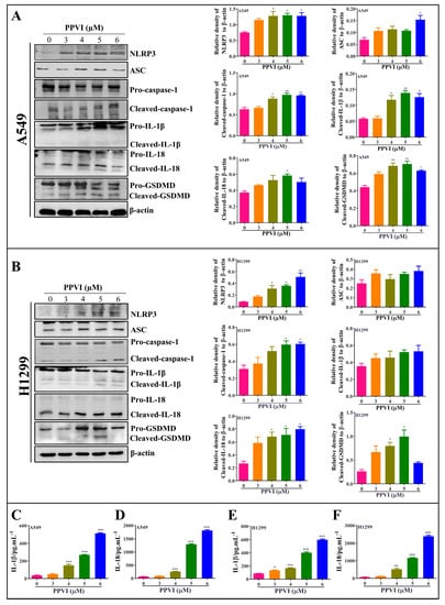 Figure 5. PPVI activated the NLRP3 inflammasome and promoted the release of IL-1β and IL-18. A549 cells (A) and H1299 cells (B) were treated with PPVI as indicated by the graded concentrations for 24 h. Cell protein was then harvested for detecting NLRP3, ASC, caspase-1, IL-1β, IL-18, GSDMD and β-actin by Western blot. Bar chart indicates the relative density of protein to β-actin; bars, S.D. * p ≤ 0.05; ** p ≤ 0.01. The full-length Western blotting images are shown in Figure S5. A549 cells and H1299 cells were treated with PPVI as indicated by gradient concentrations for 24 h. Culture medium was collected for centrifugation and the supernatant was used for the detection of the level of IL-1β and IL-18 by using a Human IL-1β ELISA Kit (CHE0001) and a Human IL-18 ELISA Kit (CHE0007). Bar chart indicates the level of IL-1β and IL-18 in the cell supernatant of A549 cells (C,D) and H1299 cells (E,F), respectively. bars, S.D. * p ≤ 0.05; ** p ≤ 0.01. *** p ≤ 0.001.