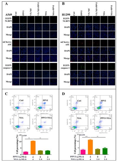 Figure 6. PPVI VX-765 and NSA reversed the activation of the NLRP3 inflammasome of PPVI-treated A549 and H1299 cells. A549 cells (A) and H1299 cells (B), transiently transfected with EGFP-N1-NLRP3, mCherry-C1-ASC and EGFP-N1-caspase-1 plasmids for 24 h, were treated with PPVI or co-treated with VX-765 or NSA and PPVI, as per the indicated concentration, for another 24 h. After treatment, the cells were fixed with 4% PFA, and the representative images were captured using the fluorescence microscope. Magnification: 20×. Scale bar: 50 μm. Pyroptotic cells of A549 cells (C) and H1299 cells (D) treated with PPVI or co-treated with NSA and PPVI, as indicated. Treatment concentrations were measured by flow cytometry using an annexin V-FITC/PI apoptotic detecting kit. Annexin V+/PI+ indicated the pyroptotic cells. Bar chart indicates the percentage of pyroptotic cells and living cells; bars, S.D. ** p ≤ 0.01, *** p ≤ 0.001.