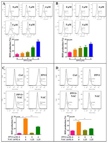 Figure 7. PPVI increased the intracellular reactive oxygen species (ROS) levels in A549 and H1299 cells. A549 cells (A) and H1299 cells (B) were treated with PPVI as indicated graded by the concentrations for 24 h. The cells were then incubated with 5 µM H2DCFDA reagent for 30 min, and the ROS generation was determined by flow cytometry. Bar chart indicates the ROS levels in A549 and H1299 cells; bars, S.D. * p ≤ 0.05; *** p ≤ 0.001. A549 cells (C) and H1299 cells (D) were treated with PPVI or co-treated with PPVI and NAC for 24 h. The cells were then incubated with 5 µM H2DCFDA reagent for 30 min, and the ROS generation was determined by flow cytometry. Bar chart indicates the ROS levels in A549 and H1299 cells; bars, S.D. * p ≤ 0.05; ** p ≤ 0.01; *** p ≤ 0.001.