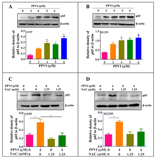 Figure 8. PPVI activated the ROS/NF-кB pathway in A549 and H1299 cells. A549 cells (A) and H1299 cells (B) were treated with PPVI as indicated by the graded concentrations for 24 h. A549 cells (C) and H1299 cells (D) were treated with PPVI or co-treated with NAC and PPVI, as indicated by the concentration shown, for 24 h. After treatment, cell protein was then harvested to detect p65 and β-actin by Western blot. Bar chart indicates the relative density of p65 to β-actin; bars, S.D. p ≤ 0.05; * p ≤ 0.01. The full-length Western blotting images are shown in Figure S6.