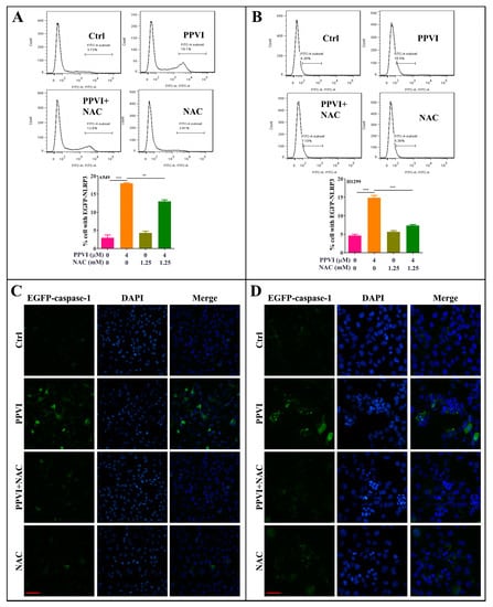 Figure 9. NAC inhibits the expression of NLRP3 and caspase-1 in PPVI treated A549 cells and H1299 cells. A549 cells (A) and H1299 cells (B) transiently transfected with EGFP-N1-NLRP3 plasmid for 24 h, treated with PPVI or co-treated with NAC and PPVI, at indicated concentrations, for another 24 h. After treatment, the cells were trypsinzed and collected for the analysis of fluorescence intensity by flow cytometry. Bar chart indicates the percentage of cells with GFP signal in A549 and H1299 cells; bars, S.D. ** p ≤ 0.01; *** p ≤ 0.001. A549 cells (C) and H1299 cells (D) transiently transfected with EGFP-N1-caspase-1 for 24 h were treated with PPVI or co-treated with NAC and PPVI at indicated concentrations for another 24 h. After treatment, the cells were fixed with 4% PFA, and the representative images were captured using the fluorescence microscope. Magnification: 40×. Scale bar: 25 μm.