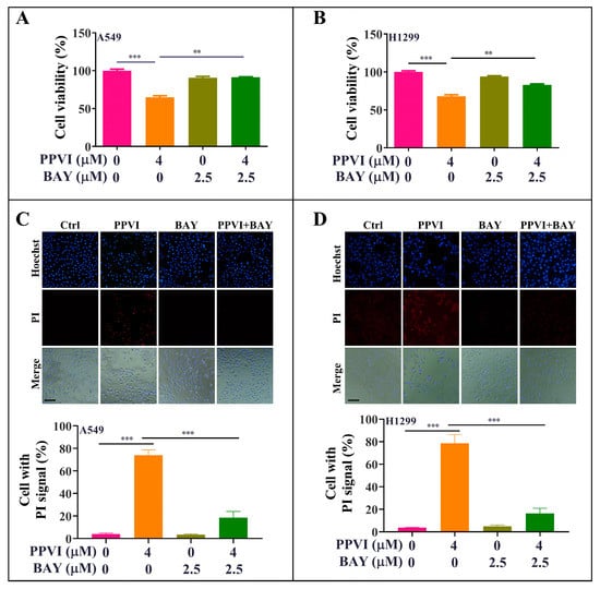 Figure 10. BAY-inhibited, PPVI-induced pyroptotic cell death in A549 cells and H1299 cells. A549 cells (A) and H1299 cells (B) treated with PPVI or co-treated with PPVI and BAY at the indicated concentration for 24 h. After treatment, the cytotoxicity was measured by MTT method, and the bar chart indicates the cell viability of A549 and H1299 cells; bars, S.D. ** p ≤ 0.01; *** p ≤ 0.001. A549 cells (C) and H1299 cells (D) treated with PPVI or co-treated with PPVI and BAY at the indicated concentration for 24 h. The cells were then stained with 2 μg/mL PI (red, staining dying cells) plus 2 μg/mL Hoechst 33342 (blue, staining all cells) for 10 min, and then observed by fluorescent microscopy. Bar chart indicates the percentage of cells with PI signal compared to blue signal; bars, S.D. *** p ≤ 0.001. Magnification: 10×, Scale bar: 100 µm.
