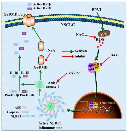 Emerging evidence indicates that the NLRP3 inflammasome is activated by a series of endogenous materials such as adenosine triphosphate, uric acid, and number of exogenous agents, including bacterial hemolysins, silica, asbestos, uric acid and alum [68]. Recently, the increased cellular generation of ROS has been found in response to the above activators. For example, crystalline silica activates the NLRP3 inflammasome through ROS and the caspase-1-dependent pathway [69]. In addition, ROS induced by silica was decreased in NLRP3-deficient macrophages [70]. Therefore, ROS is an upstream event of NLRP3 inflammasome activation. In addition, NF-κB proteins, a family of transcription factors, play an important role in inflammation and immunity [71]. Recent studies suggest that the NF-κB pathway was recognized to regulate the activation of the NLRP3 inflammasome [72]. Moreover, ROS could activate NF-κB through the IκB kinase (IKK)-dependent pathway [73]. Therefore, the ROS/NF-κB signaling pathway plays an important role in the activation of the NLRP3 inflammasome. For the NF-κB signaling pathway in the NLRP3 inflammasome, most researchers found that Acetyl-NF-κB p65 (Lys310) was upregulated and the NF-κB signaling pathway was activated, and ultimately activated the NLRP3 inflammasome [74,75,76,77]. Therefore, the Acetyl-NF-κB p65 (Lys310) antibody, which recognizes the overexpressed levels of the NF-κB p65 protein acetylated at Lys310, was also used in this study. The result showed that PPVI significantly increases ROS level and activates the NF-κB signaling pathway in A549 and H1299 cells. As expected, NAC could decrease PPVI-induced ROS generation. Furthermore, NAC also inhibited the NF-κB signaling pathway in PPVI-treated A549 and H1299 cells. To further validate the correlation of cell death with the activated NLRP3 inflammasome, as well as the increased ROS level in PPVI-treated A549 and H1299 cells, we found that NAC could reverse NLRP3 expression and cell death induced by PPVI. Moreover, BAY could increase the cell viability of PPVI-treated A549 and H1299 cells. Therefore, all the data in this study were summarized in the diagram showed in Figure 11, which clearly clarified the anti-proliferation effect of PPVI and its action mechanism in NSCLC. In conclusion, our study showed for the first time that PPVI isolated from TTM induces caspase-1-mediated pyroptotic cell death via the activation of the ROS/NF-κB/NLRP3/GSDMD signal axis in A549 and H1299 cells. These findings provide evidence and novel insights for PPVI’s development into a novel candidate for the treatment of NSCLC.