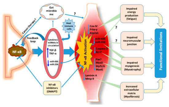 Systemic actions of breast cancer on skeletal muscles lead to functional limitations. Tumors in the breast release growth factors and cytokines into the circulating system. In response to tumors, host immune cells in breast tissue and other organs also release growth factors and cytokines into circulation. These growth factors and cytokines activate NF-κB in tumors, which further enhance the expression and release of growth factors and cytokines into circulation. Circulating growth factors and cytokines such as TGF-β and TNF-α are transported into skeletal muscles where, through their selective receptors, activate signaling molecules such as NF-κB in myogenic cells. Activated NF-κB regulates a series of molecules through its downstream signaling, feedback regulations, and cross-talk interactions. Tumor-induced reduction of Cox-IV, Prka-γ and Atp2a1 in skeletal muscles results in defective energetic regulation leading to fatigue in breast cancer patients. miR-486 and miR-206 are expressed in the mitochondria of myofibers, but their role in regulating energy remains unknown. Reduced expression of Pax7, MyoD, Myf5/6, and MyoG in skeletal muscles impairs proliferation and differentiation of MuSCs, which is exacerbated by downregulation of Bcl-2, miR-486, and miR-206. These actions lead to myogenic defects such as reduced number and size of myofibers, which is associated with myoatrophy. Downregulation of Mmp-9 and laminin A in skeletal muscles could contribute to increased ECM deposition and myofibrosis. Decreased expression of muscle-specific miR-486 and miR-206 may contribute to their lower levels in circulation. Whether the neuromuscular junction is affected by breast cancer is unknown. Furthermore, whether the tumor itself or cancer treatment affects the gut microbiome, which then changes muscle function, is unknown. Overall, breast cancer-induced impairment of myogenesis, energetic inefficiency, and ECM remodeling leads to functional limitations, which may be manifested clinically as fatigue, muscle weakness, fibromyalgia with and without overt cachexia. Pharmacological intervention through inhibitors of NF-κB such as DMAPT is a promising therapeutic strategy.