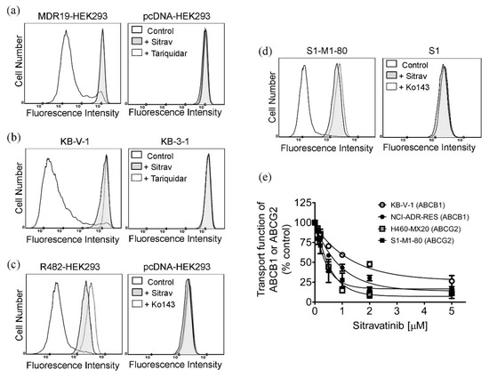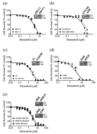 Previous studies have reported that tyrosine kinase inhibitors (TKIs) such as imatinib [26,27,28,29] and sunitinib [30,31] are transported substrates of ABCB1 and ABCG2 and the overexpression of ABCB1 or ABCG2 in cancer cells results in reduced susceptibility to TKIs [32,33,34]. To this end, we examined whether cells overexpressing ABCB1 or ABCG2 are less sensitive to sitravatinib than the drug-sensitive counterpart cells. We found that the ABCB1-overexpressing human KB-V-1 epidermal cancer cells (Figure 1a) and the ABCB1-overexpressing human NCI-ADR-RES ovarian cancer cells (Figure 1b) are equally sensitive to sitravatinib as their drug-sensitive parental KB-3-1 and OVCAR-8 cancer cells, respectively. Similarly, we found that the ABCG2-overexpressing human S1-M1-80 colon cancer cells (Figure 1c) and the ABCG2-overexpressing human H460-MX20 lung cancer cells (Figure 1d) are equally sensitive to sitravatinib as their parental S1 and H460 cancer cells, respectively. To further confirm our findings, we compared the cytotoxicity of sitravatinib in HEK293 cells and HEK293 cells transfected with human ABCB1 (MDR19-HEK293) or human ABCG2 (R482-HEK293). As shown in Figure 1e, these HEK293 cell lines are equally sensitive to sitravatinib treatment. The IC50 value of sitravatinib in tested cell lines are summarized in Table 1 and the resistance factor (R.F) value, signifying the degree of resistance caused by the overexpression of ABCB1 or ABCG2, was calculated by dividing the IC50 value of sitravatinib in ABCB1- or ABCG2-overexpressing cell lines by the IC50 value of sitravatinib in respective parental cell lines.