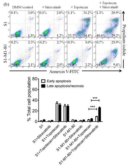 In order to distinguish the potential growth retardation effect from the drug-induced cytotoxicity restored by sitravatinib, we examined the effect of sitravatinib on apoptosis induced by colchicine or topotecan, both known inducers of apoptosis [38,43], in ABCB1-overexpressing KB-V-1 cancer cells and ABCG2-overexpressing S1-M1-80 cancer cells, respectively. Drug-sensitive parental cancer cells and multidrug-resistant cancer cells were treated with the indicated drug regimens as detailed in Materials and Methods. As shown in Figure 3a, while 500 nM of colchicine induced substantial apoptosis in KB-3-1 cells (from approximately 5% basal level to 50% of early and late apoptosis), it had minimal effect on the level of apoptosis in ABCB1-overexpressing KB-V-1 cells (from approximately 5% basal level to 7% of early and late apoptosis) for colchicine, a transported substrate of ABCB1 [37]. We found that treatment with sitravatinib alone did not induce apoptosis in KB-3-1 or KB-V-1 cells but it significantly increased the colchicine induced apoptosis in KB-V-1 cells, from 7% to 58 % of total apoptosis. Moreover, as shown in Figure 3b, when treated with 5 μM of topotecan, the proportion of apoptotic cells increased significantly, from approximately 5% basal level to 58% of early and late apoptosis in S1 cells but not in ABCG2-overexpressing S1-M1-80 cells due to ABCG2-mediated efflux of topotecan. Although treatment with sitravatinib alone did not substantially induce apoptosis in S1 or S1-M1-80 cells, it significantly enhanced the topotecan-induced apoptosis in S1-M1-80 cells, from 8% to 35% of early and late apoptosis.