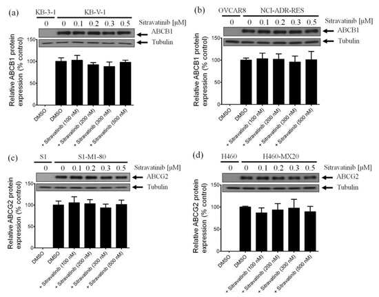 Several reports have demonstrated that in addition to inhibiting the drug efflux function of ABCB1 and ABCG2, the transient down-regulation of these transporters is one of the common alternative mechanisms in which the multidrug-resistant cancer cells can be re-sensitized to chemotherapy [23,47,48]. To this end, we examined the protein expression of ABCB1 in KB-V-1 cancer cells and ABCG2 in S1-M1-80 cancer cells by immunoblotting after treating cells with sitravatinib at various concentrations (100–500 nM) for 72 h as described in Materials and Methods. As shown in Figure 5, we were unable to find any significant changes in the protein level of ABCB1 in KB-V-1 cells (Figure 5a and Figure S1) and NCI-ADR-RES cells (Figure 5b and Figure S2) or ABCG2 in S1-M1-80 cells (Figure 5c and Figure S3) and H460-MX20 cells (Figure 5d and Figure S4), indicating that the down-regulation of ABCB1 and ABCG2 is unlikely to play a major role in the resensitization of multidrug-resistant cancer cells by sitravatinib. Our data suggest that sitravatinib re-sensitizes ABCB1- and ABCG2-overexpressing multidrug-resistant cancer cells by attenuating the drug transport function of ABCB1 and ABCG2.