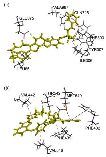 Docking of sitravatinib with ABCB1 protein structure revealed that sitravatinib may bind to the substrate-binding sites by interacting with seven amino acid residues on transmembrane helices. Two aromatic rings, as well as cyclopropyl group on sitravatinib, were predicted to interact with PHE303, ILE306, TYR307, ALA987 and LEU65 via hydrophobic interaction. Hydrogen bond was found between the amide carbonyl on sitravatinib and GLN725 and GLU875 may interact with protonated nitrogen moiety on thienopyridine via both hydrogen bonding and charge interaction (Figure 6a). The binding of sitravatinib with ABCG2 protein was predicted to lie within the substrate-binding cavity between two ABCG2 monomers. One hydrogen bond was observed between residue THR542 and the amine on the tail of the sitravatinib structure. Four hydrophobic interactions were found between VAL442, VAL546, MET549 and PHE432 amino acid residues and pyridinyl/fluorophenyl moieties and PHE439 were predicted to interact with the cyclopropyl group (Figure 6b).