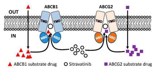 Simplified schematic diagram of sitravatinib resensitizing multidrug-resistant cancer cells by blocking the active efflux of chemotherapeutic drugs mediated by ABCB1 and ABCG2. Normally, substrate drugs of ABCB1 (red triangles) and substrate drugs of ABCG2 (purple squares) are rapidly pumped out of a multidrug-resistant cancer cell overexpressing ABCB1 (blue) or ABCG2 (orange) and consequently leading to reduced chemosensitivity. In this model, sitravatinib (white circles) competes with the binding of substrate drugs at the substrate-binding pockets of ABCB1 and ABCG2 to increase the intracellular accumulation of therapeutic drugs and eventually restoring the chemosensitivity of multidrug-resistant cancer cells.