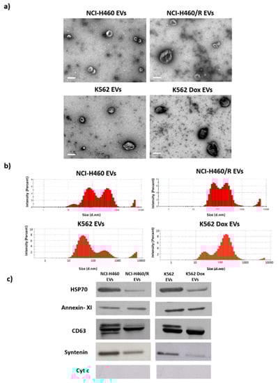 Characterization of extracellular vesicles (EVs) isolated from pairs of drug-sensitive and multidrug resistance (MDR cells), from non-small cell lung cancer (NSCLC) and chronic myeloid leukemia (CML) cell lines (NCI-H460/ NCI-H460/R and K562/K562Dox, respectively). (a) Morphology of EVs, analyzed by TEM. Bar corresponds to 200 nm. (b) EVs’ size distribution, analyzed by dynamic light scattering (DLS). (c) Levels of HSP70, Annexin XI, CD63, syntenin, and cytochrome in EVs, analyzed by Western blotting.