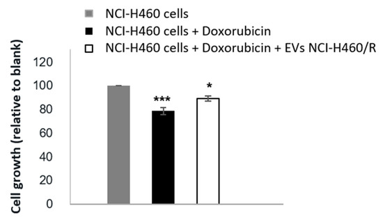 Effect of EVs released by MDR (NCI-H460/R) cells from NSCLC on the response of drug-sensitive cells (NCI-H460) to doxorubicin treatment. Cell growth was determined on drug-sensitive cells (grey bar), and drug-sensitive cells co-cultured without (black bar) or with (white bar) EVs released by MDR cells using the sulphorhodamine B (SRB) assay. Results are the mean ± S.E. of three independent experiments. * p < 0.05; *** p < 0.001 (NCI-H460 cells without drug treatment vs. with doxorubicin treatment).