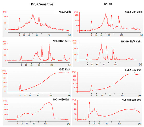Profile of small RNAs from drug-sensitive and MDR counterpart cells and from the EVs released by those cells. Cells were from two models: NSCLC (NCI-H460 and NCI-H460/R) and CML (K562 and K562Dox). RNA was analyzed using the Small RNA chip of the Bioanalyzer 2100 Agilent. Images are representative of three independent biological replicates.