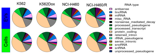 A pie chart of the distribution of mapped reads showed a similar composition of RNA from cells and from EVs released by those cells (Figure 4). Among non-coding RNAs, high levels of pseudogenes were found in all conditions (13–17%). Moreover, in agreement with the Bioanalyzer profile, EVs released by NSCLC cells showed higher levels of miRs, when compared with EVs released by CML cells. Importantly, multiple dimensional scaling analysis and principal component analysis revealed a cluster between the independent replicates in all conditions, indicating proper reproducibility. Furthermore, the two independent clusters observed for drug-sensitive vs. MDR conditions, in cells and EVs from both tumor models, suggest that the results have biological relevance (Supplementary Figures S2a,b and S3a,b).