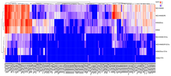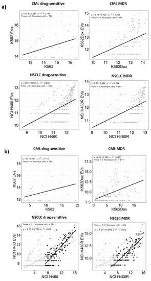 There are different triggering factors for MDR traits, some of which are tumor-specific mechanisms (e.g., genetic alterations). Notably, as mentioned above, in the present work, a hematological (CML) and a non-hematological (NSCLC) tumor model were studied. The cellular features of both models are very different, but both the MDR cell lines have the overexpression of P-gp as the main mechanism responsible for their MDR phenotype in common. Therefore, the study of these two different tumor MDR models may allow the identification of alterations associated with an MDR phenotype caused by (or responsible for) P-gp overexpression. Importantly, in the hierarchical clustering of miRs, each pair of cell lines (drug-sensitive and MDR) clustered together, suggesting that the drug-resistant phenotype has a smaller effect on miRs regulation than the source of the cell line. The same result was observed for EVs.
