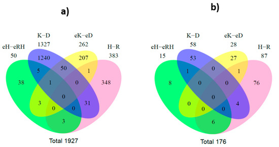 Venn diagram of significantly differentially regulated RNA species (A) and miRs (B). eH: NCI-H460 EVs; eRH: NCI-H460/R EVs; eK: K562 EVs; eD: K562Dox EVs; H: NCI-H460 cells; R:NCI-H460/R cells; K-K562 cells; D: K562Dox cells.