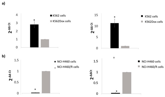 For both tumor models, two miRs for each model were selected for further validation of the NGS results, conducted by quantitative real time PCR (qRT-PCR). The total RNA (2 ng) was reverse transcribed using the miScript II Reverse Transcription Kit (Qiagen, Hilden, Germany), according to the manufacturer’s instructions. The miRNA expression levels were then measured using the miSCRIPT Primer Assay and the Quantitect SYBR Green PCR Kit (Qiagen), according to the manufacturer’s instructions. Dissociation curves were generated. The relative expression ratio for each miR was normalized to another miR found to be abundantly expressed and whose expression levels did not differ between drug-sensitive and MDR conditions in both NSCLC and CML models (miR-19b-3p). Data was analyzed with the 2−ΔΔCt method [84].