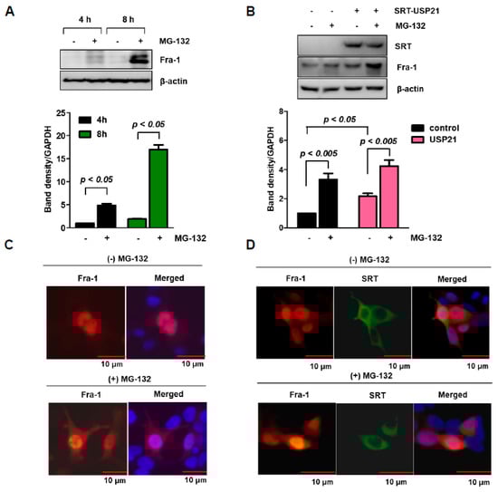 Fra-1 protein is degraded by proteasomes. (A) HCT116 cells were treated with or without MG-132 for 4 h and 8 h, and then endogenous Fra-1 protein expression was examined by Western blotting. Band intensities were quantified as shown in the bottom panel. (B) HCT116 cells were transfected with SRT-USP21 for 24 h and then treated with or without MG-132 for 6 h before cell harvesting. Total cell lysates were analyzed by Western blotting. Quantification of band intensities was statistically analyzed by one-way ANOVA (n = 3). (C) 293T cells were transfected with plasmid encoding Fra-1, and immunostaining for Fra-1 was performed in the absence or presence of MG-132 treatment for 6 h. Images of Fra-1 (red) and nuclei (blue) were obtained with a confocal fluorescent microscope (scale bar = 10 μm). (D) 293T cells were co-transfected with Fra-1 and SRT-USP21 plasmids for 24 h and were then treated with MG-132 for 6 h before cell fixation. The cells were stained with anti-Fra-1 (red) and anti-SRT (green) antibodies, respectively. Nuclei (blue) were stained with DAPI, and a merged cell image of the three colors is shown (scale bar = 10 μm).